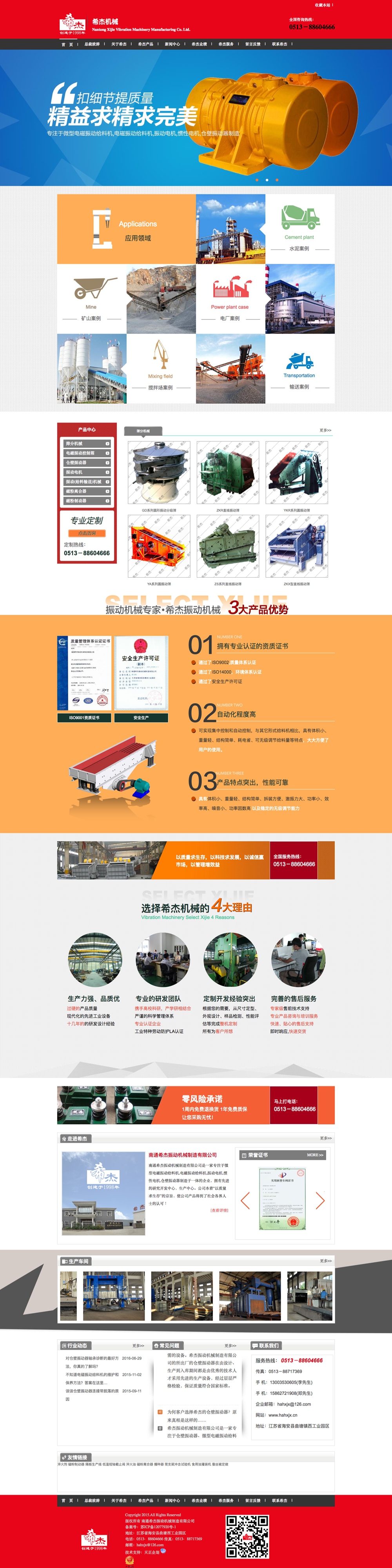 此網站為南通希杰振動機械制造有限公司網站模板樣式。該模板是根據不同層次劃分信息區域的一個設計。主頁中紅色的設計運用總給人一種熱情、誠信的心理感受。讓整個設計看上去別出心裁而且對于信息的傳遞起到了加分的作用。